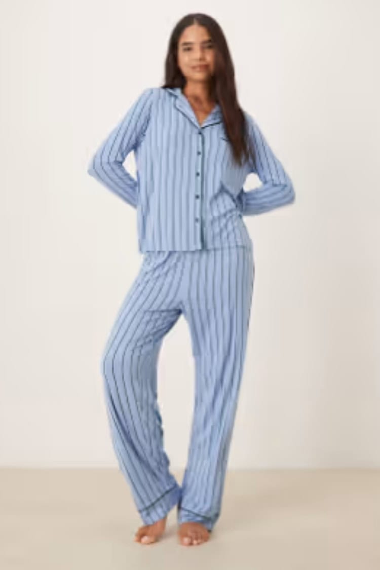 • Matching PJs: Striped or flannel pajamas in icy blue or white for a relaxed morning look.
