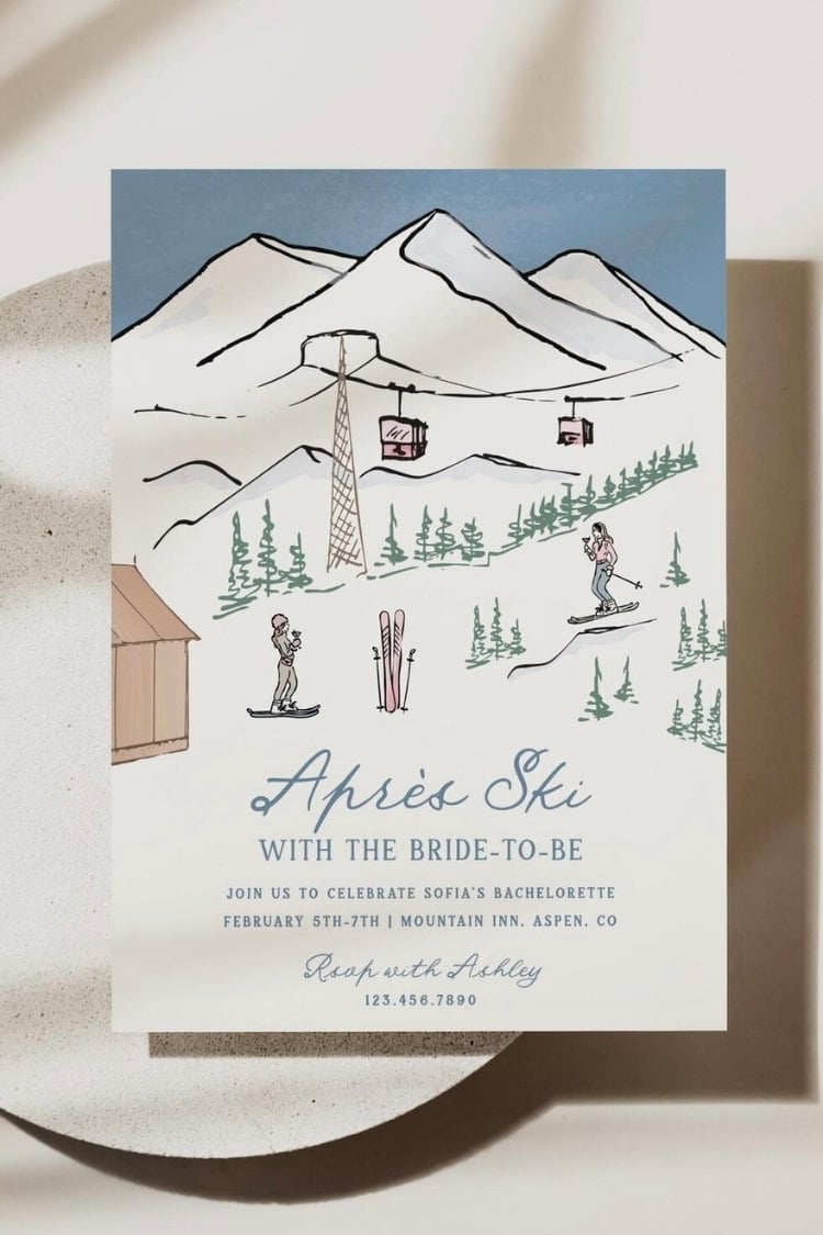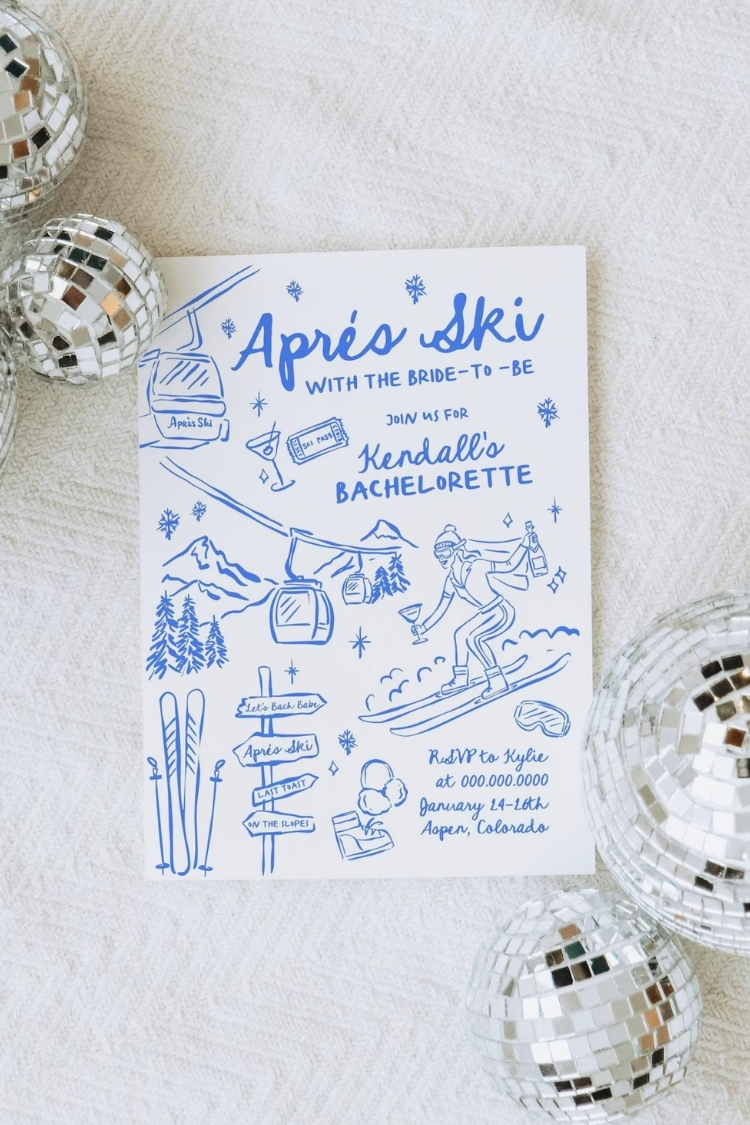 Add polish to your event with matching stationery or digital templates. Look for designs featuring ski lifts, mountains, or martini glasses to match the Après Ski look.