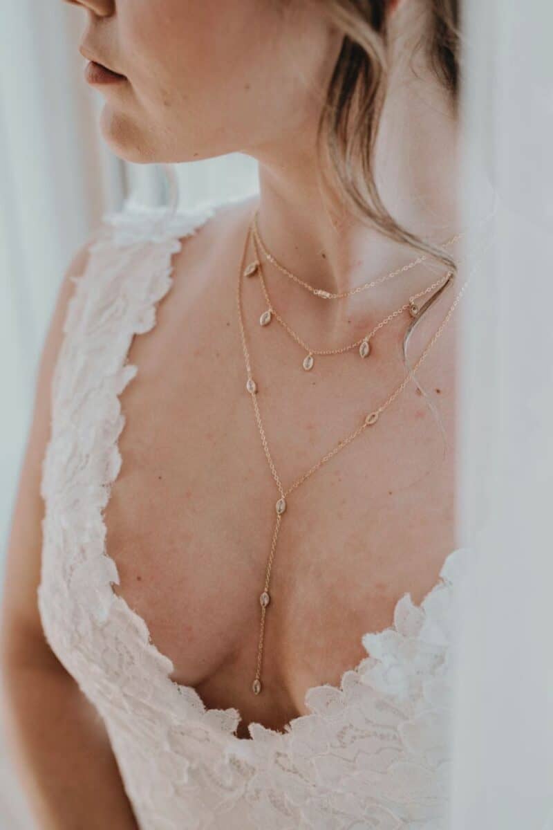 Start clean and minimal for the ceremony. Shift to layered chains or sculptural pieces for the reception. Mixing vintage and contemporary pieces adds meaning without feeling too perfect or matched.