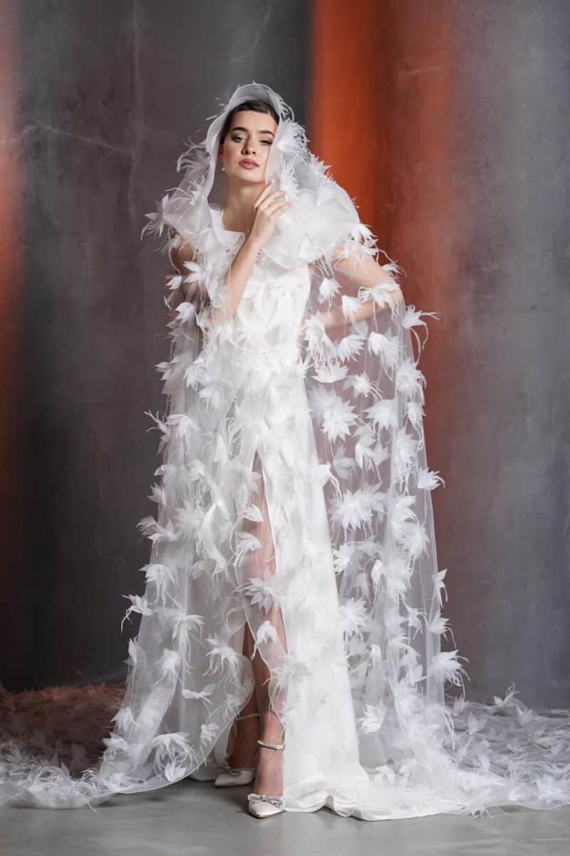Wear a tulle cape for ceremony coverage and remove it for the reception. A structured silk-wool cape feels couture and suits winter weddings or civil ceremonies.