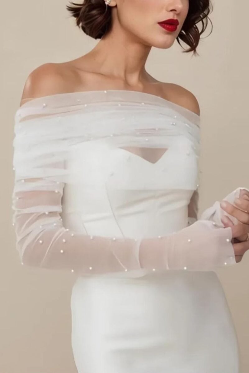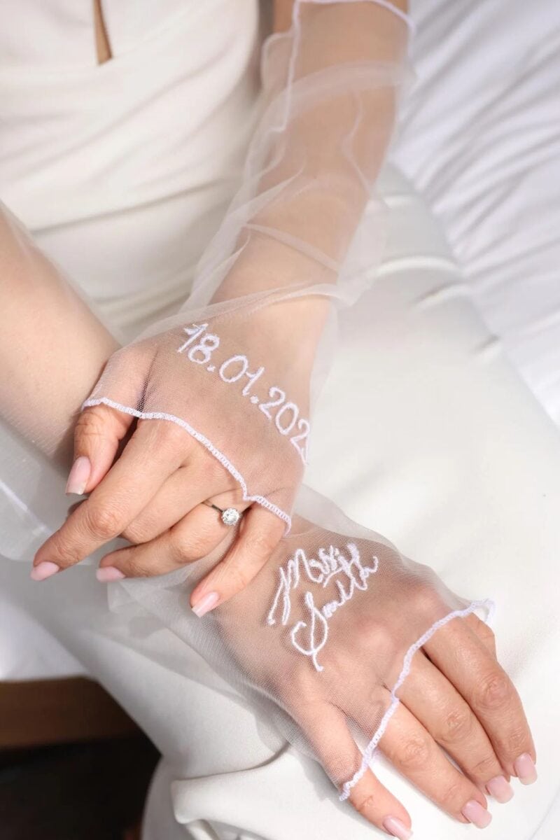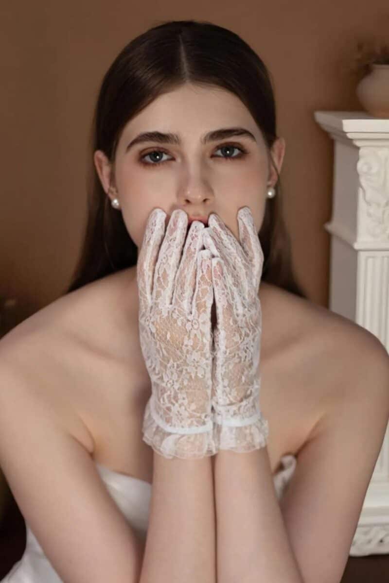 Tulle gloves feel modern and editorial. Lace gloves suit romantic gowns and strapless necklines. Detachable puff sleeves create an instantly softer ceremony look and can be removed for dancing.