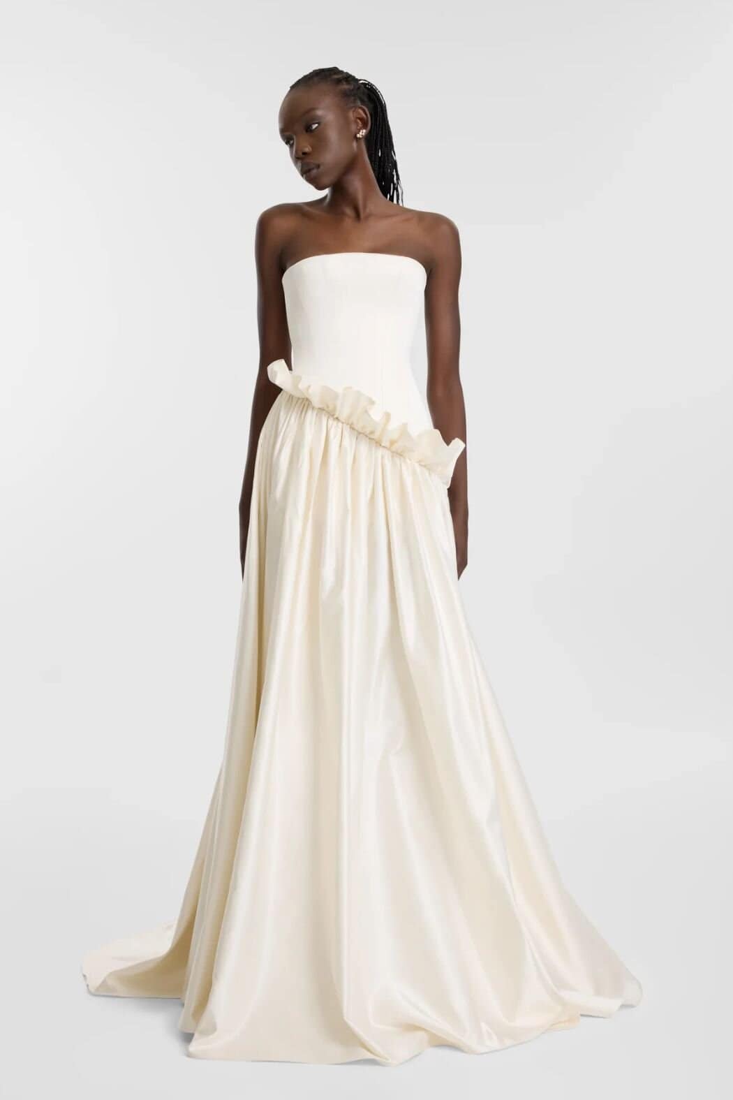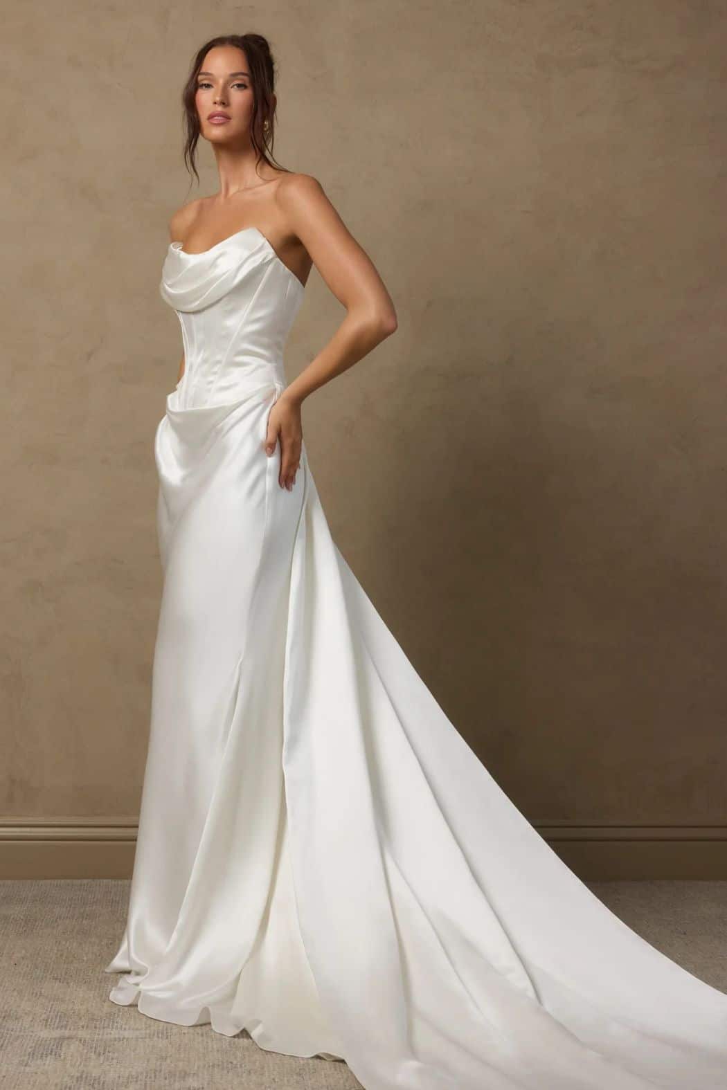 Architectural gowns draw inspiration from contemporary design with clean silhouettes, structural seaming and modern proportions. These pieces feel engineered rather than decorated and create a striking presence in photographs.