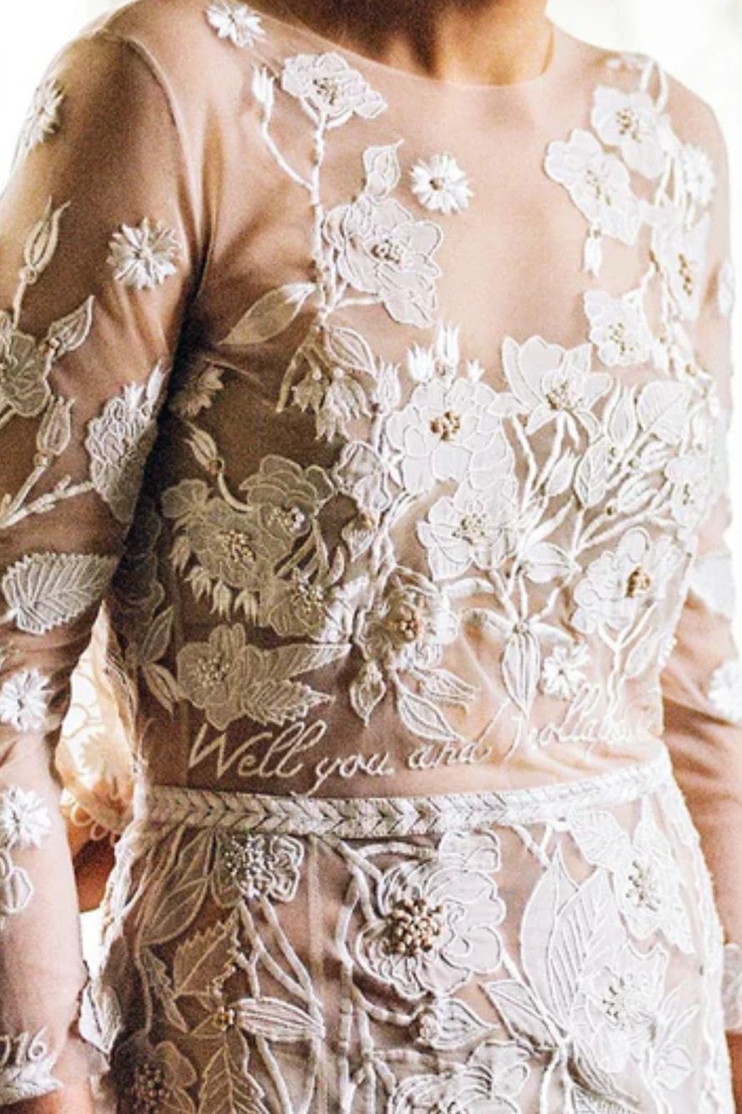 Emotional embroidery is becoming a defining bridal detail. Designers are weaving vows, poetry and symbolic motifs into gowns in ways that feel intimate and deeply personal. Delicate messages hidden in hems and linings turn each dress into a wearable love letter.