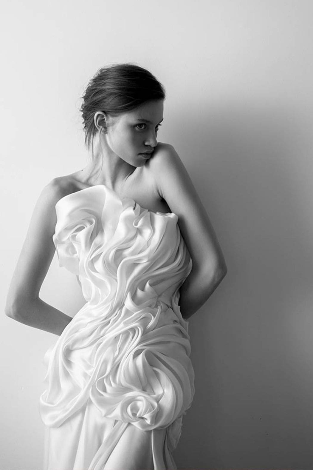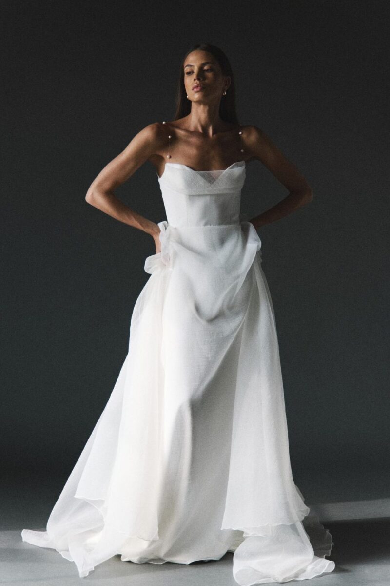 Sculptural folds, structured bodices and precise tailoring bring a gallery like quality to modern bridal design.