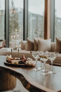 If your bride has a chic, modern vibe, this is the perfect mix of elegance and fun. Style the space with sleek barware, neutral linens, and pops of gold or black. Host a martini-making night with a few signature drinks named after inside jokes or the couple’s story. Pair with small bites or a classy dinner and finish with a cozy fireside cocktail hour. You can even turn it into a mini “Cabin Cocktail Party” complete with tasting cards and photo-worthy bar setups.