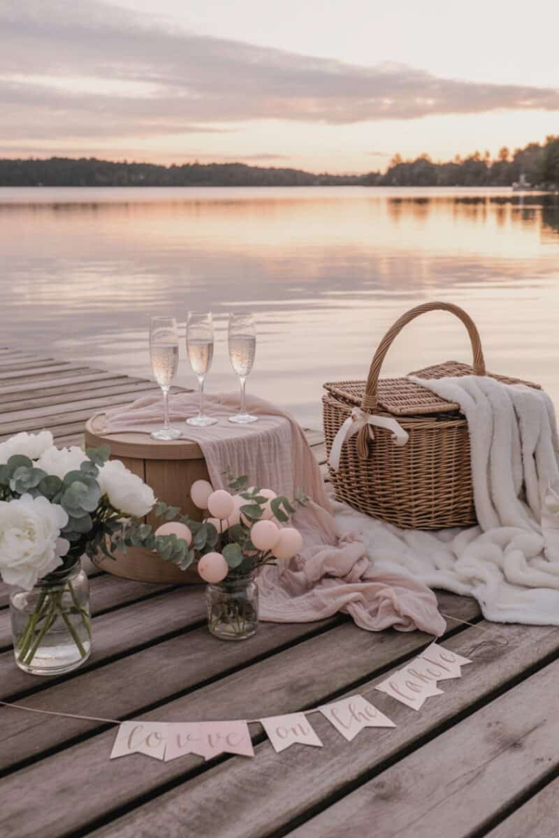 A dreamy summer or early fall option that’s all about sunshine and relaxation. Plan brunch by the water, bring matching swimsuits or robes, and rent paddleboards or kayaks for a fun afternoon activity. In the evening, host a lakeside dinner or picnic at sunset with candles, string lights, and champagne. Nautical-inspired touches like blue linens, rope details, or shell decor tie it together beautifully. It’s calm, romantic, and perfect for a bride who loves nature but still wants a stylish setting.