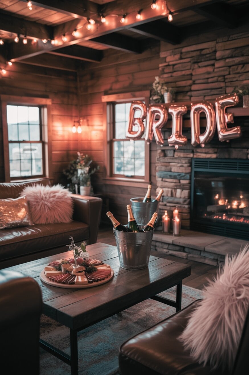 Keep it simple but thoughtful. Fairy lights, cozy throws, and candles instantly make any cabin feel magical. Add a few themed touches to tie everything together — like matching drink tumblers, a s’mores bar sign, or a “Bride’s Cabin” banner above the fireplace.