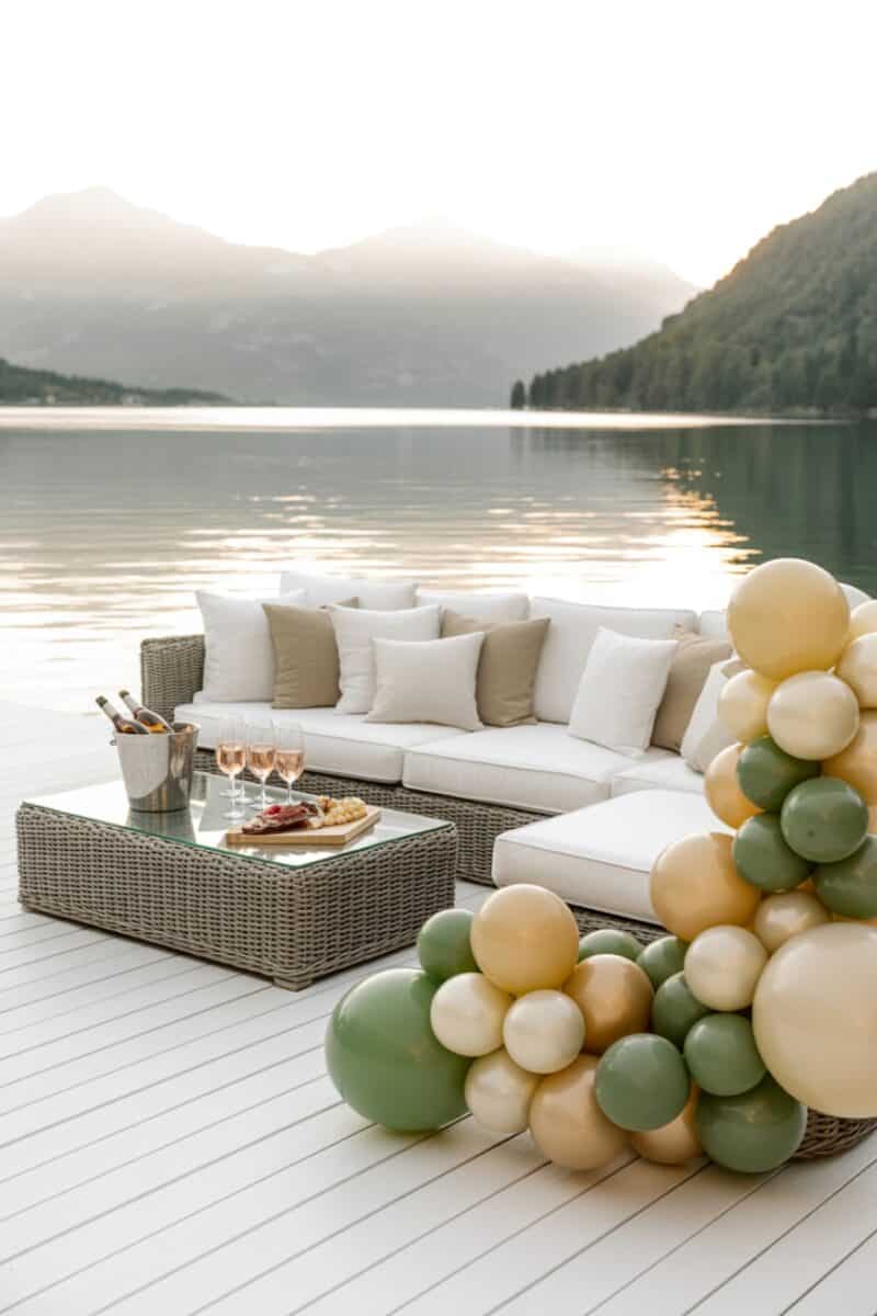 • Focal feature: Use one large, reusable piece as the main outdoor photo point. A balloon arch at the end of the dock, a banner on the railing, or a canoe filled with drinks or flowers gives strong visual impact without much effort.