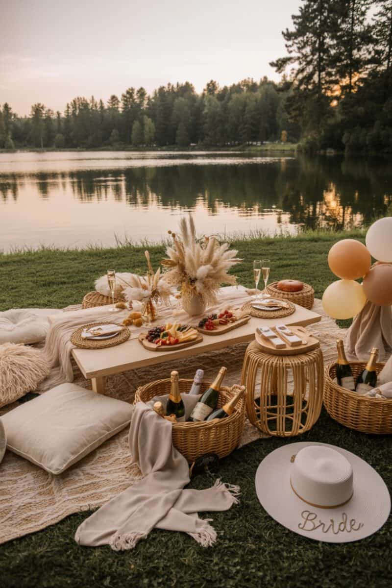 • Lakeside picnic with rugs, cushions, and grazing boards