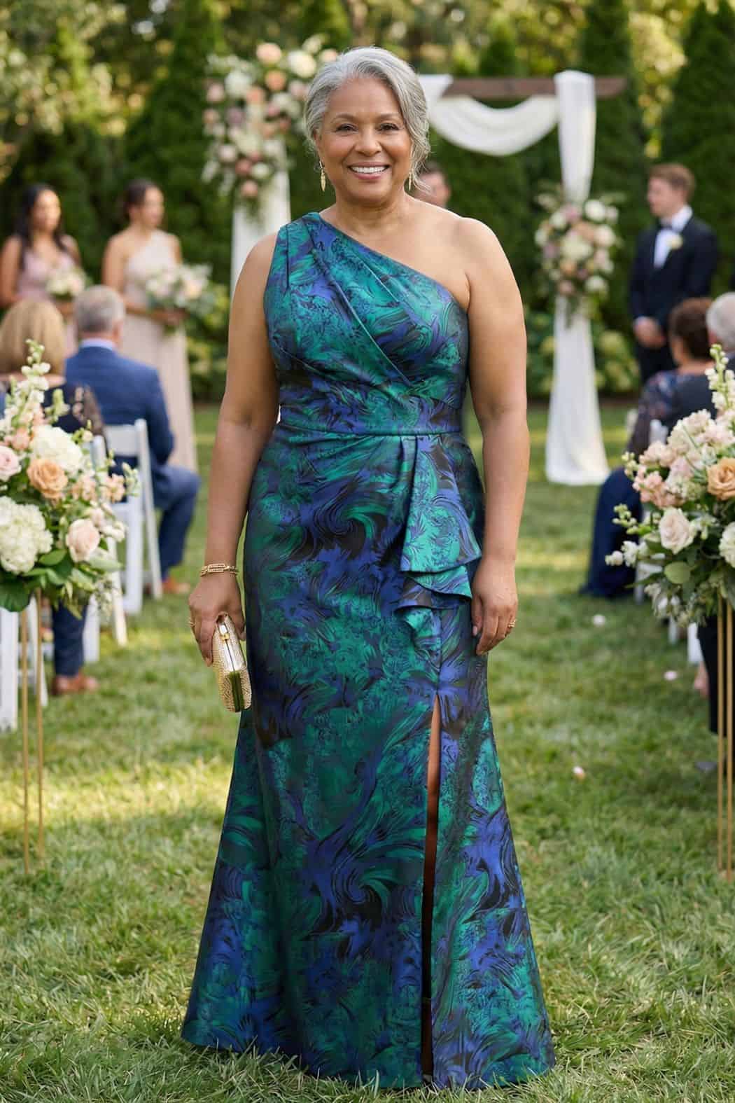 This one shoulder jacquard gown is an excellent option for curvy mothers who want a dress that feels secure, structured, and flattering without being heavy or restrictive.