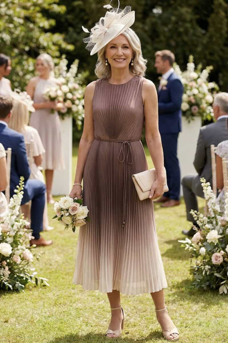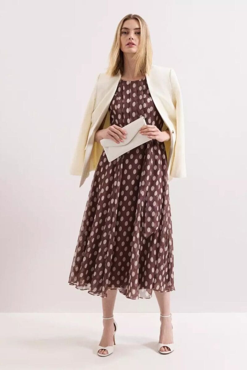 The midi length and sleeveless cut keep the look light and wearable, while the fabric drapes nicely and moves as you walk. It’s the kind of dress that feels considered and graceful, especially for mothers who prefer something understated but still full of character.