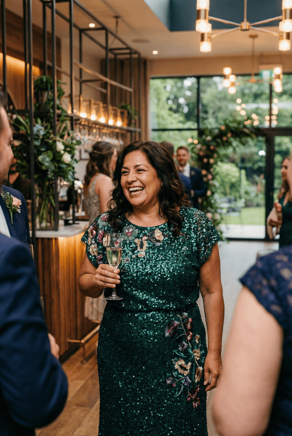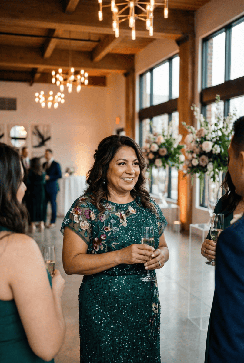 This emerald green sequin gown is a great option for mothers who want something polished, confident, and a little more glamorous without feeling overdone. The all-over beadwork gives the dress structure and movement, helping it photograph beautifully from every angle, while the rich green base keeps it firmly in “wedding-appropriate” territory.