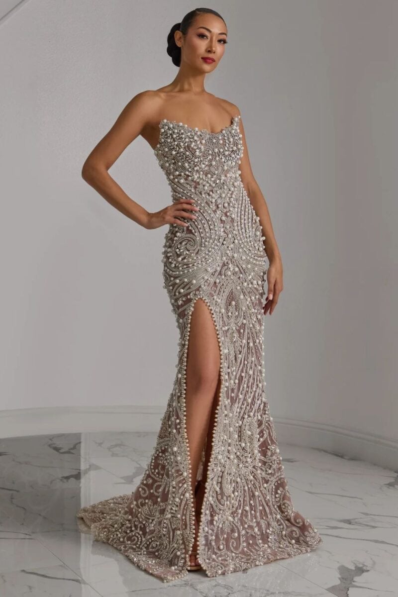 The brand blends corsetry, sculptural tulle, and couture techniques to create gowns that feel artistic rather than traditional.