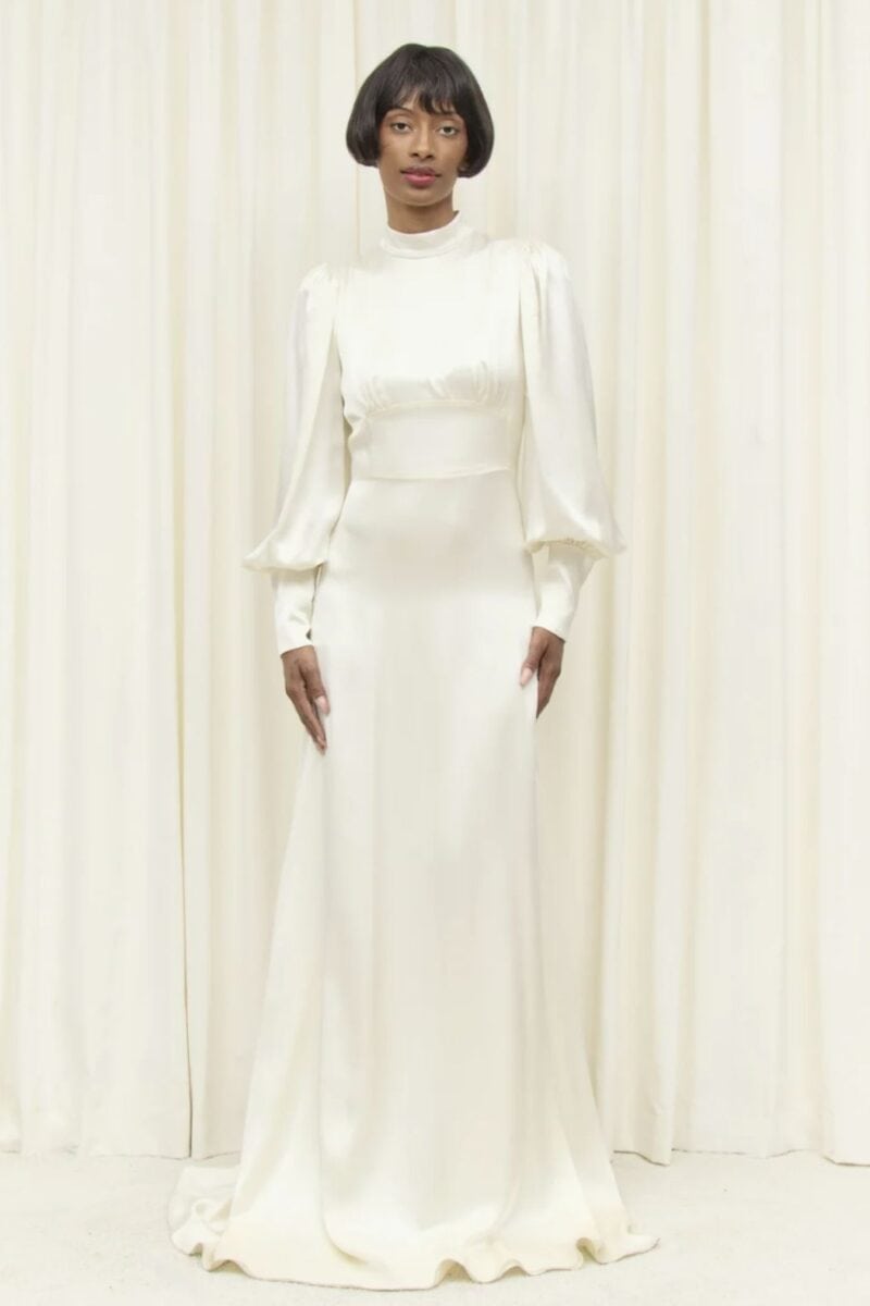 Brides who want clean lines, architectural silhouettes, and eco conscious fabrics will gravitate toward this brand. Ferrah works especially well for brides who appreciate minimalism but still want something nontraditional and directional.