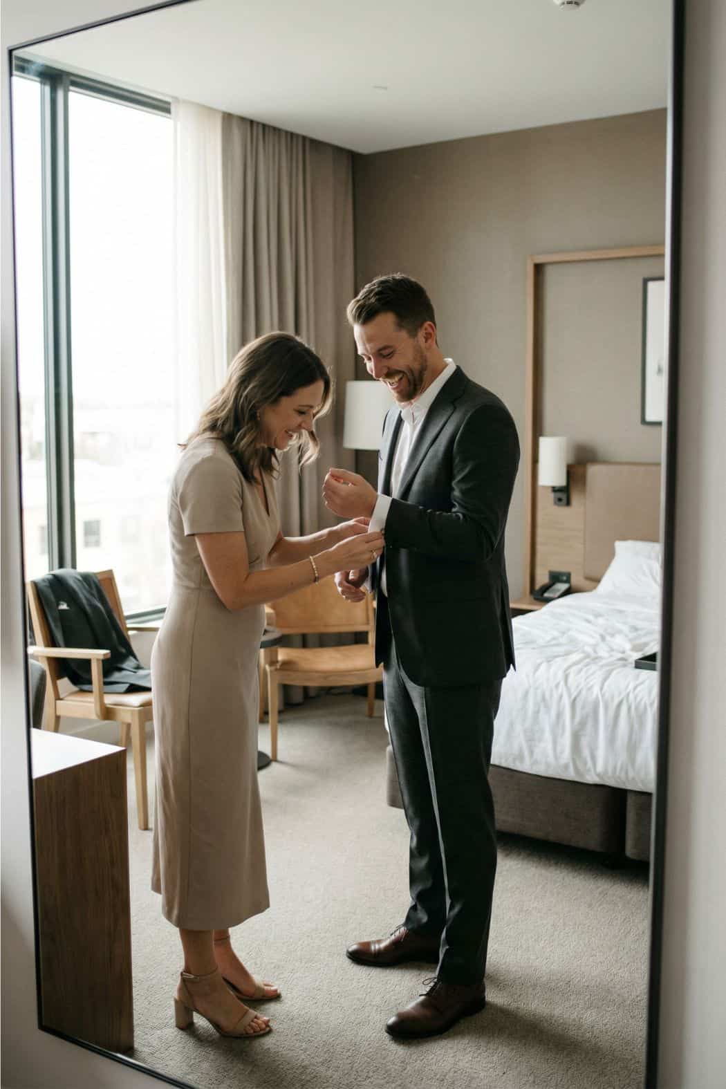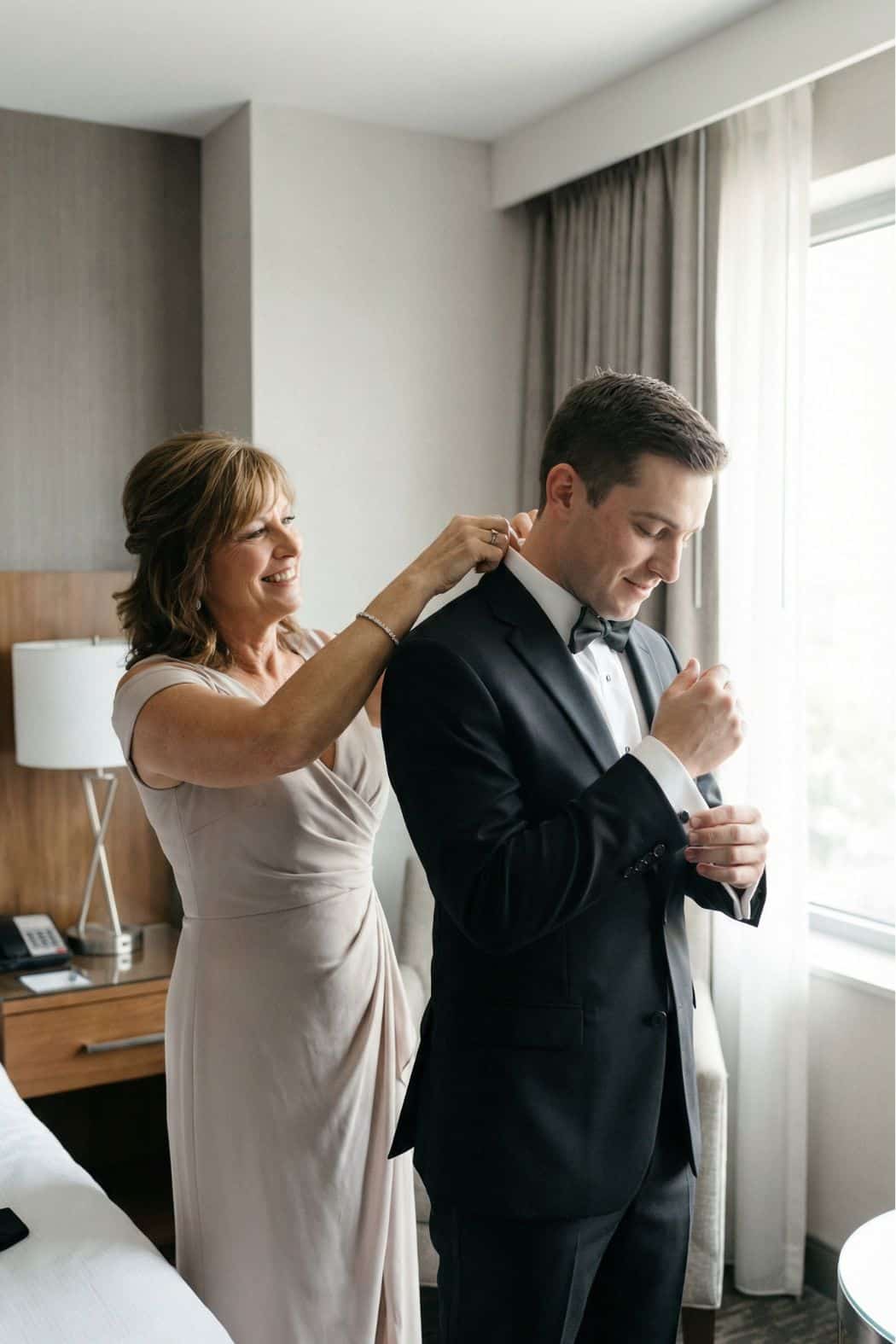 - Mother of the groom helping her son get ready or sharing a quiet moment beforehand