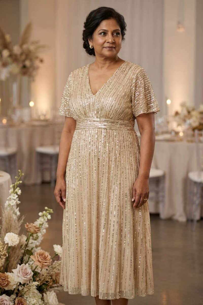 - Structured Fabrics – Materials with a bit of weight, such as crepe, ponte, or brocade, help smooth and shape the body rather than clinging to every curve. These fabrics provide a more polished and refined look.