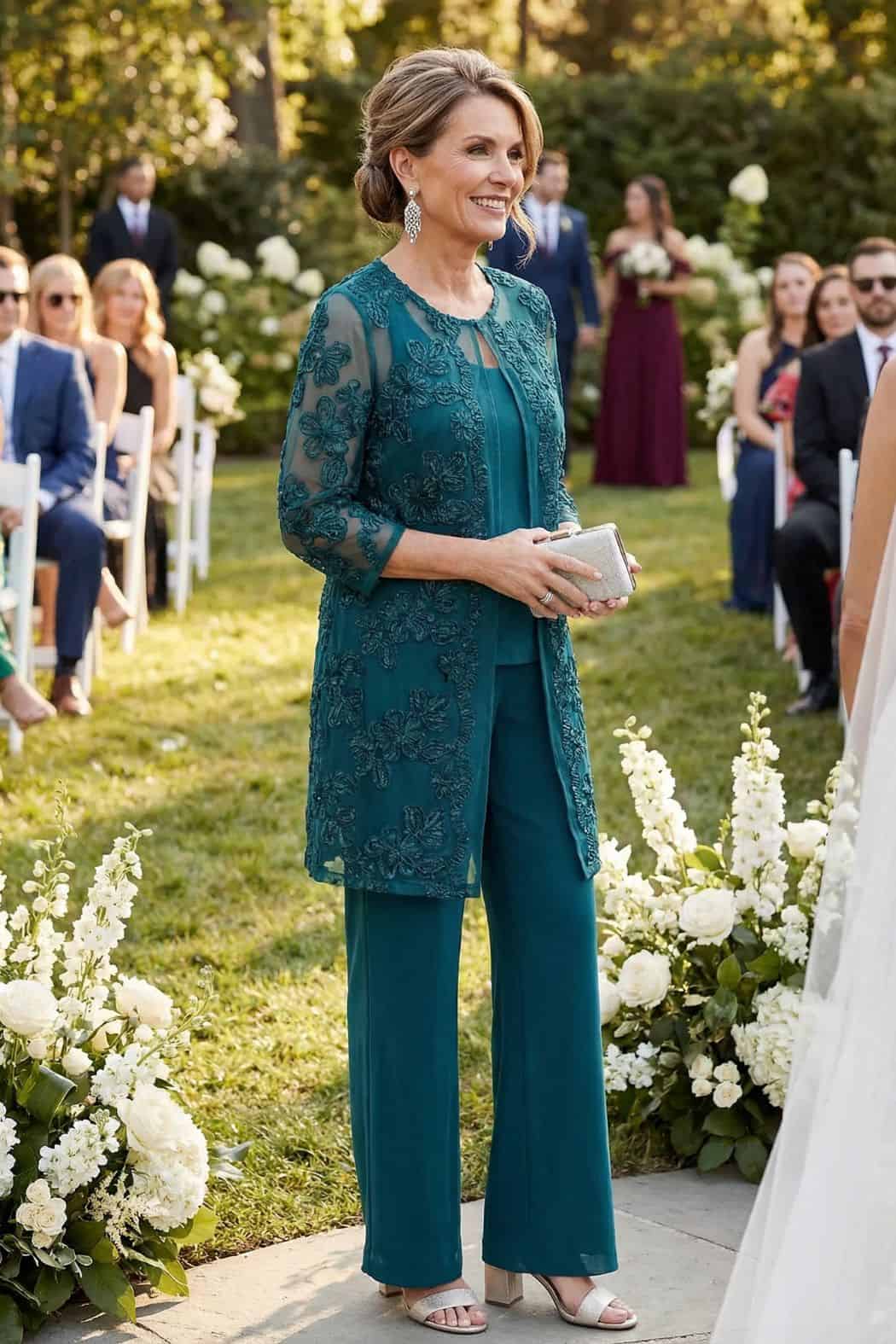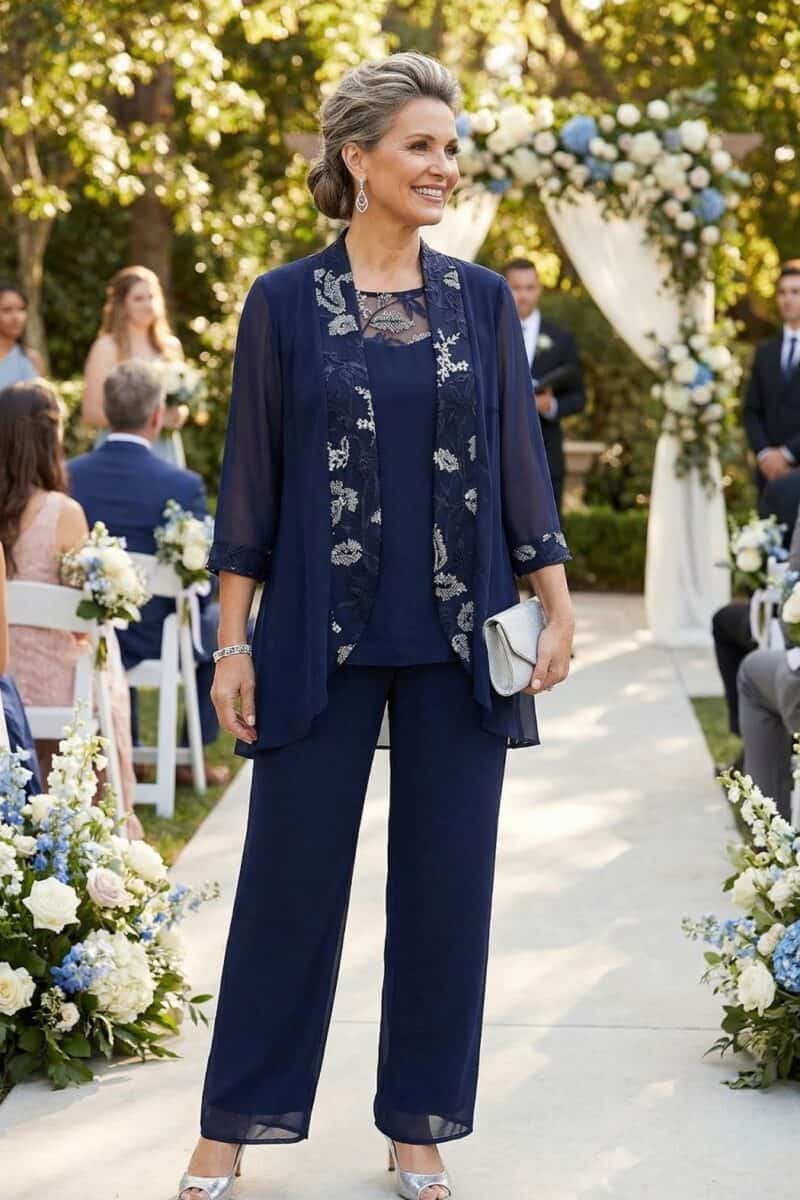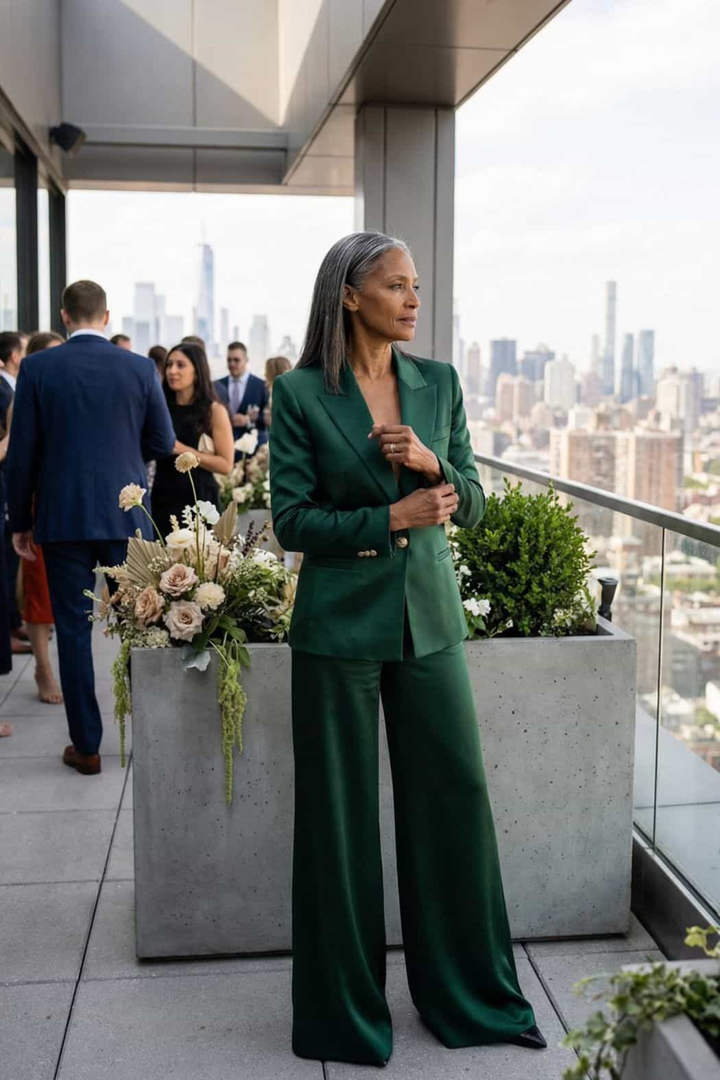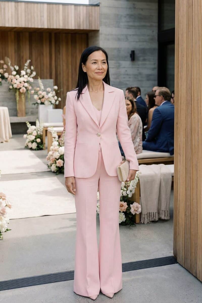 This is a great option for mothers who don’t see themselves in traditional “mother of the bride” outfits and want a suit that feels modern, powerful, and completely appropriate for a wedding without feeling dated or overly formal.