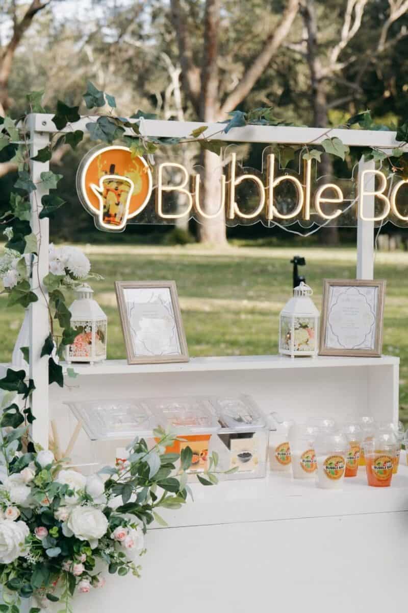 Bubble tea bars offer a fully customisable drink experience. Guests choose their tea base, toppings, and sweetness level, turning drinks into a small activity rather than a quick grab. These stations work well as a non-alcoholic option or as a playful alternative to traditional cocktails.