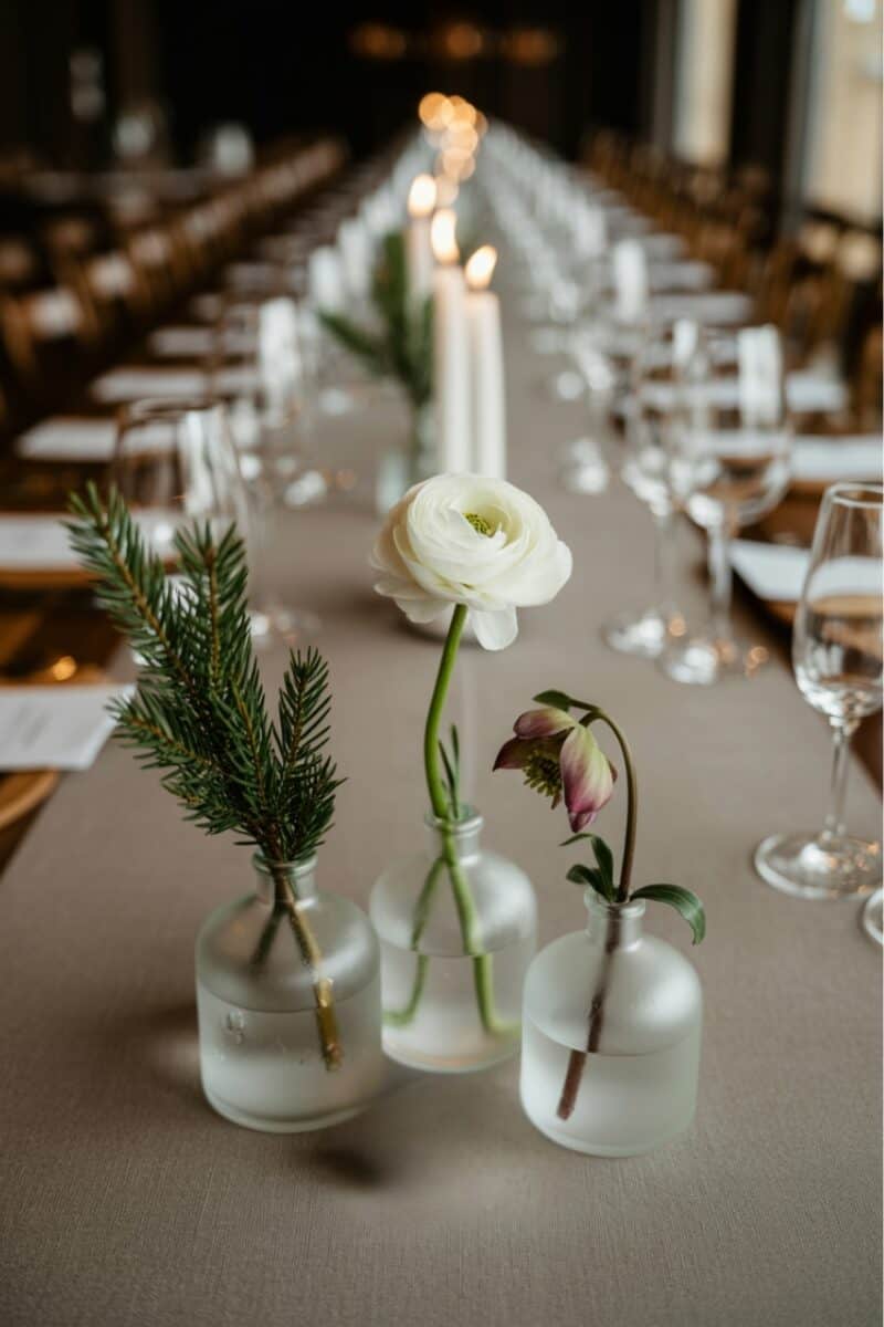 Keep things light and minimal with clusters of frosted glass bud vases. Each can hold a single evergreen sprig, white ranunculus, or hellebore. The look is clean, seasonal, and perfect for long banquet-style tables.