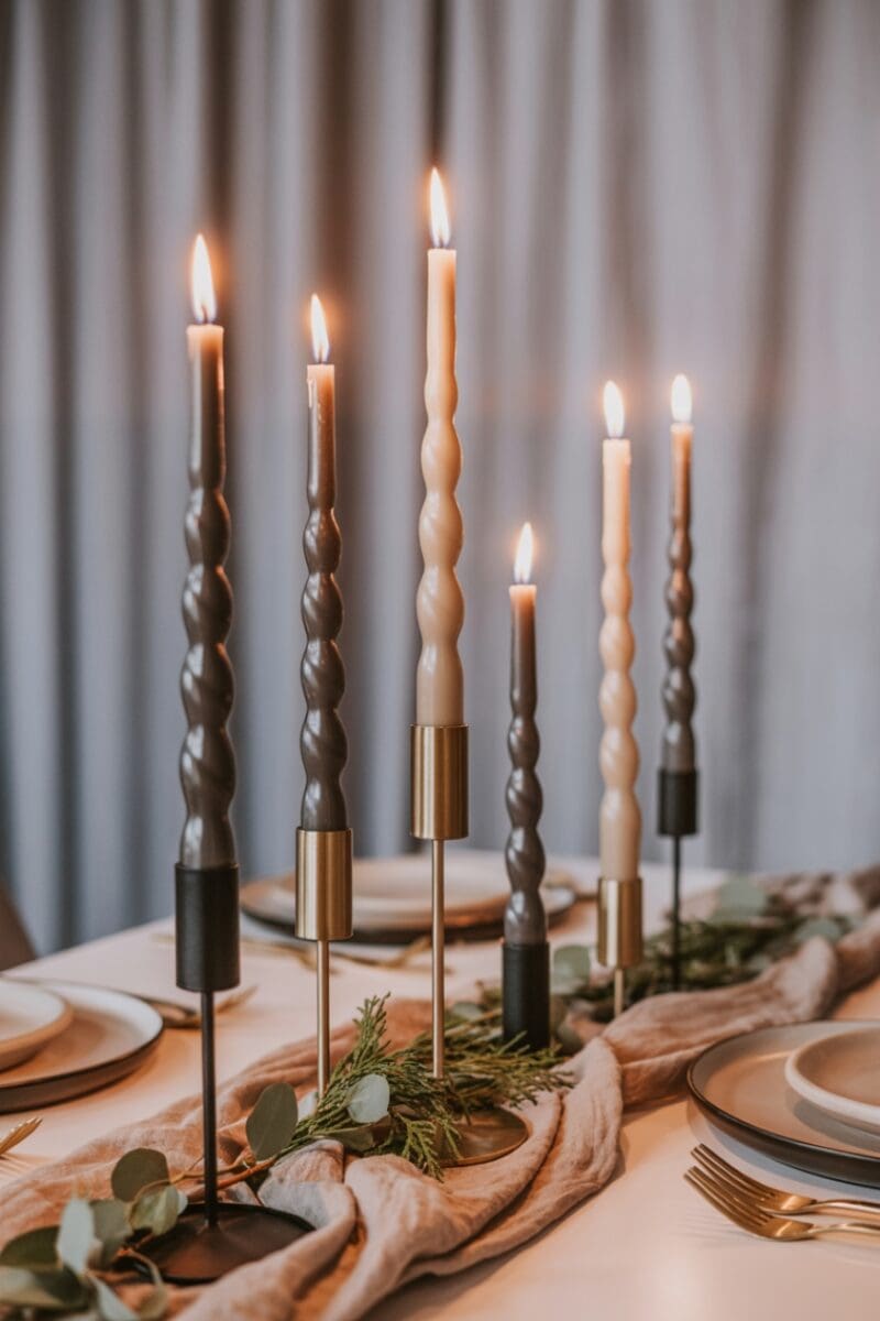 Candles are a winter essential, but you can make them modern by choosing sculptural or twisted taper candles. Place them in sleek holders — matte black, brass, or glass — and pair with a soft runner for contrast.