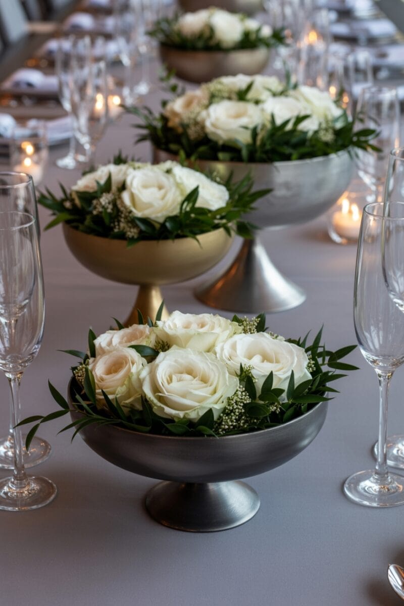 Low metallic bowls filled with white florals and greenery feel luxe and seasonal without being heavy. Gold, silver, or matte black finishes elevate the look and reflect candlelight beautifully.