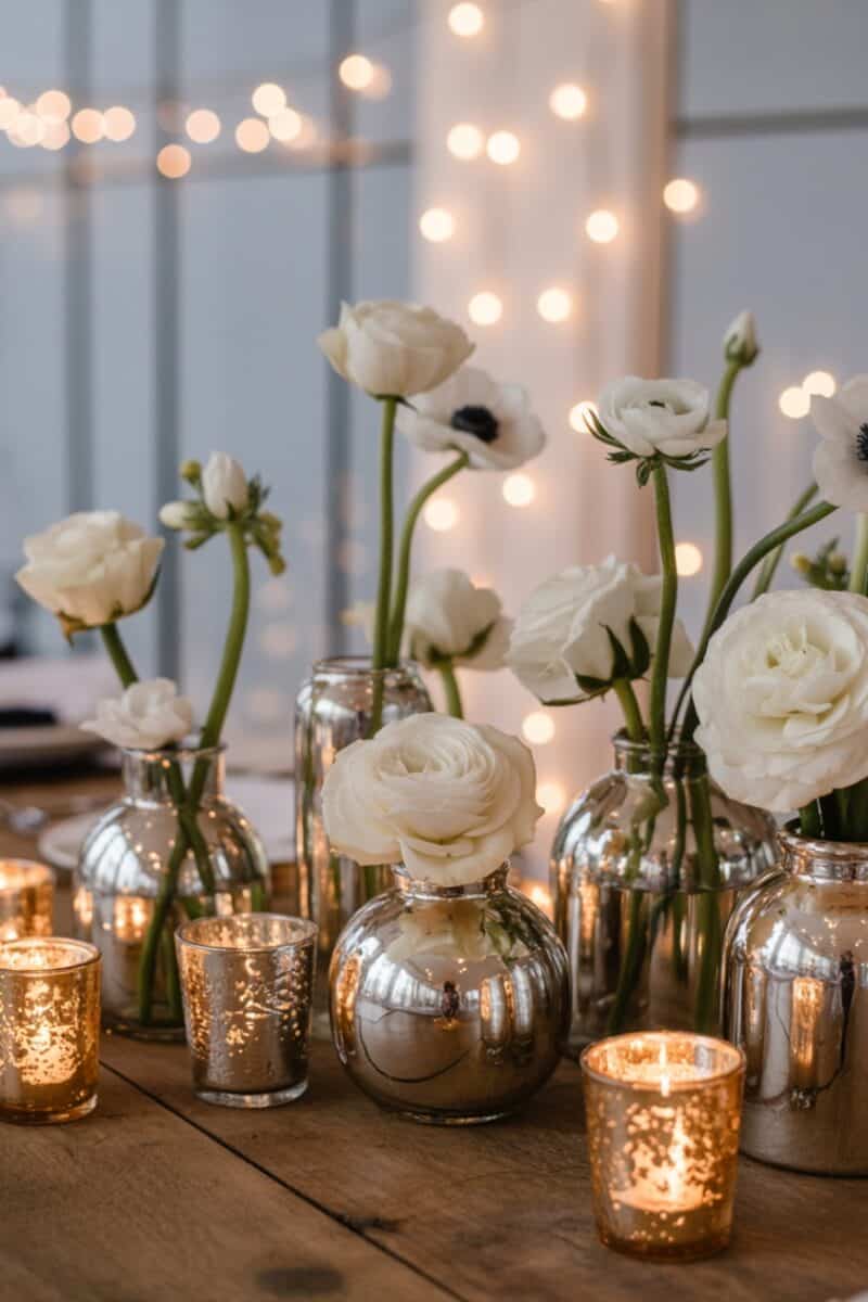Mix mercury glass votives and vases with simple white roses, anemones, or ranunculus. The shimmer of mercury glass brings a festive, wintery glow without feeling overdone.