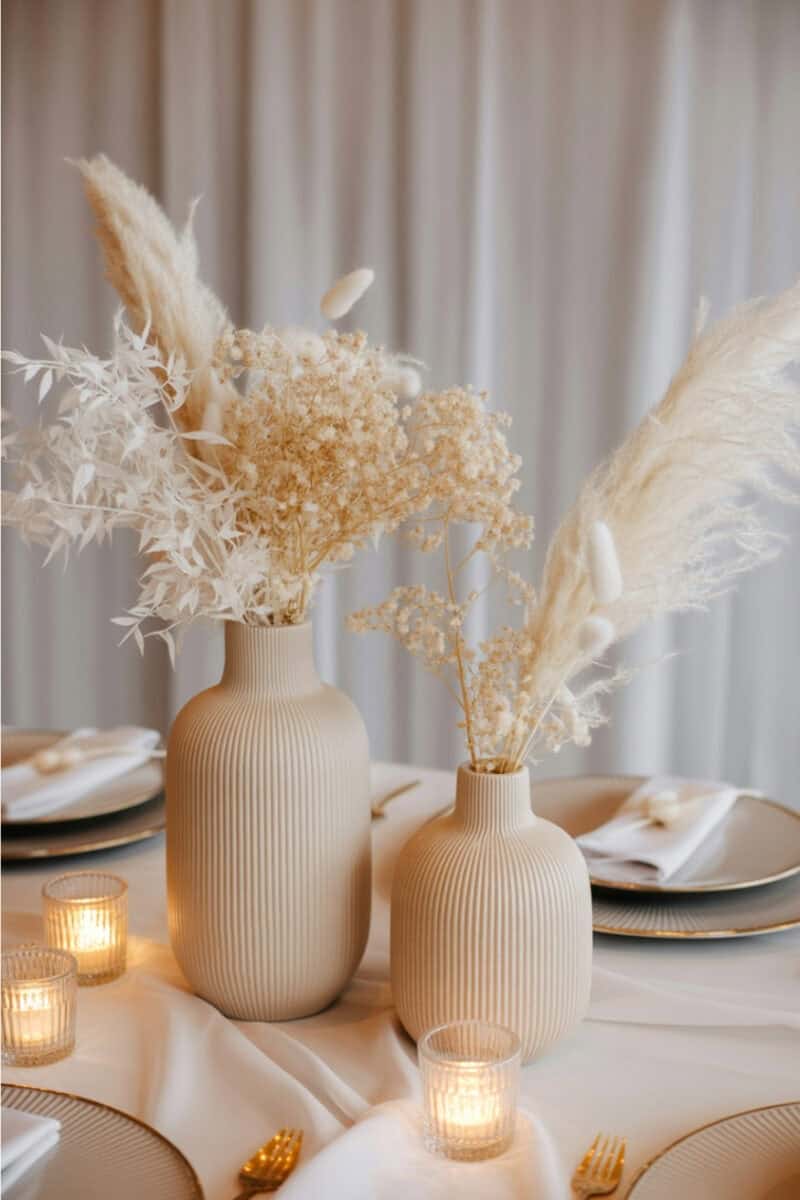 Neutral ribbed ceramic or pleated vases feel architectural and modern. Fill them with dried lunaria, pampas, or a single stem orchid for a statement without overwhelming the table.
