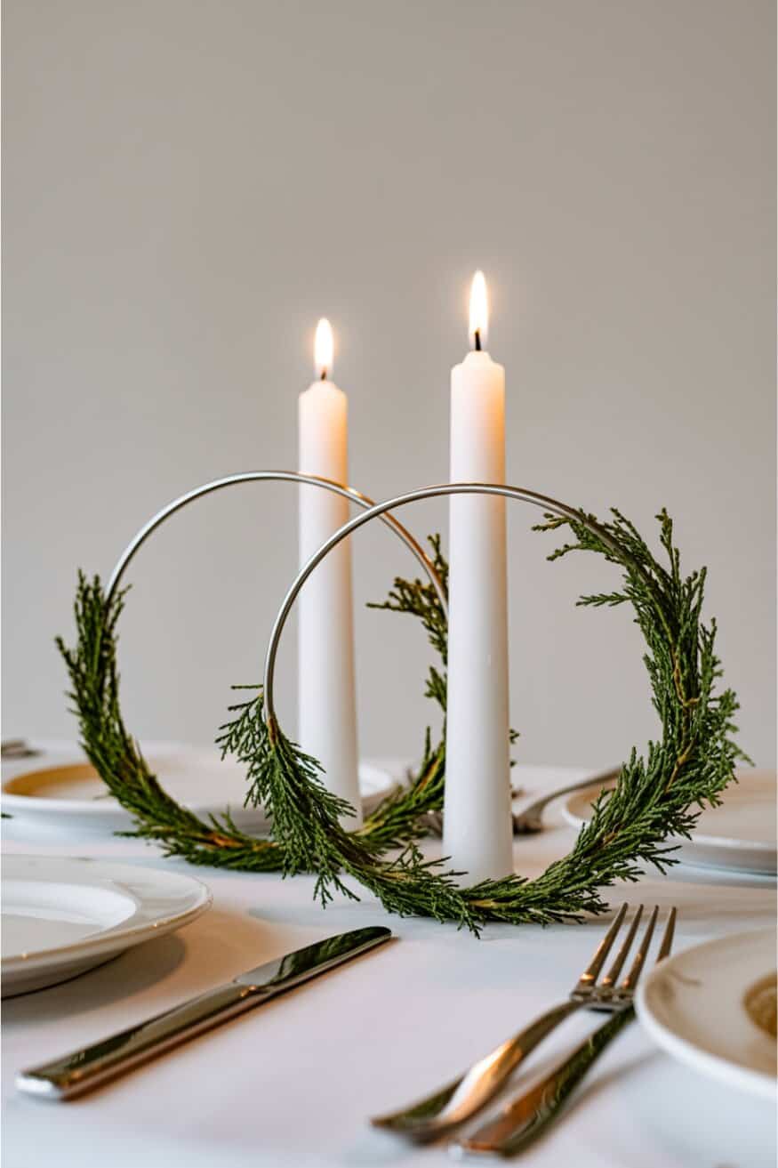 Swap out rustic wreaths for slim metal hoops wrapped lightly with eucalyptus or cedar. Place a pillar candle in the center of each for a centerpiece that’s seasonal yet streamlined.