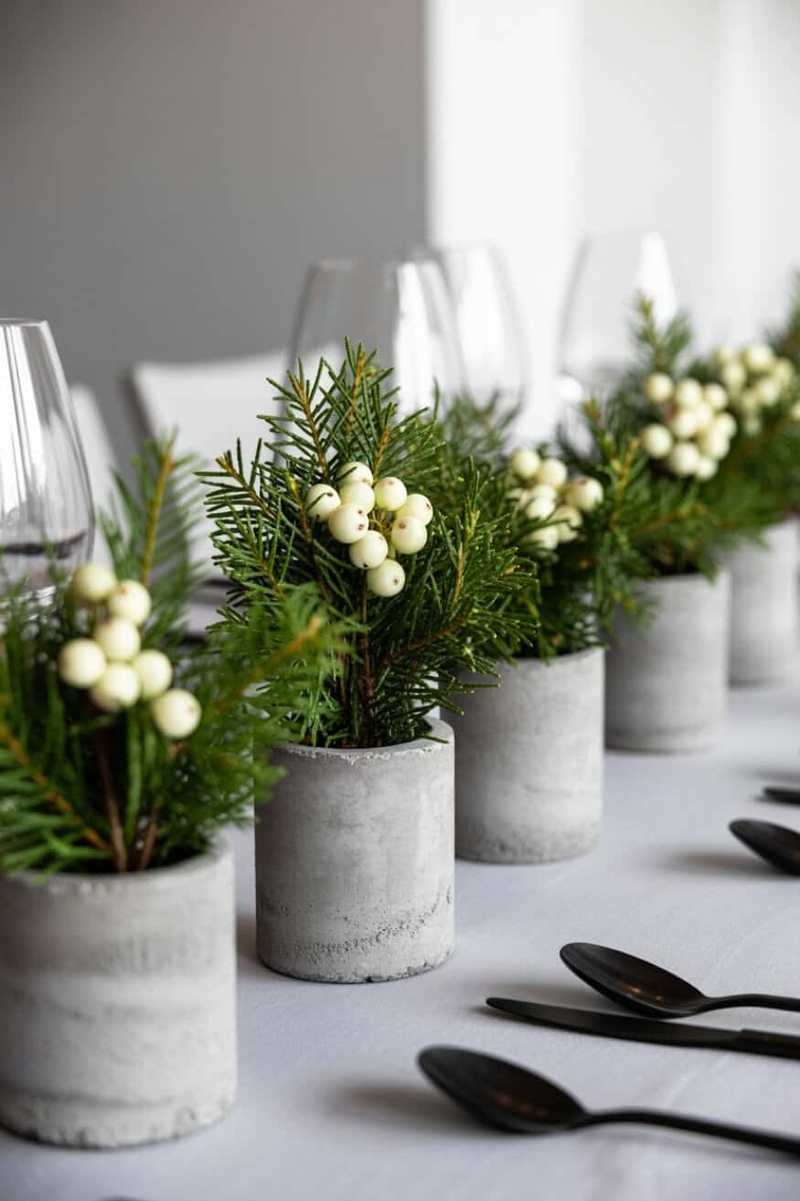 Concrete vessels instantly add a contemporary edge. Fill them with evergreen branches and white berry sprigs for a clean, sculptural centerpiece that works in industrial or minimalist venues.
