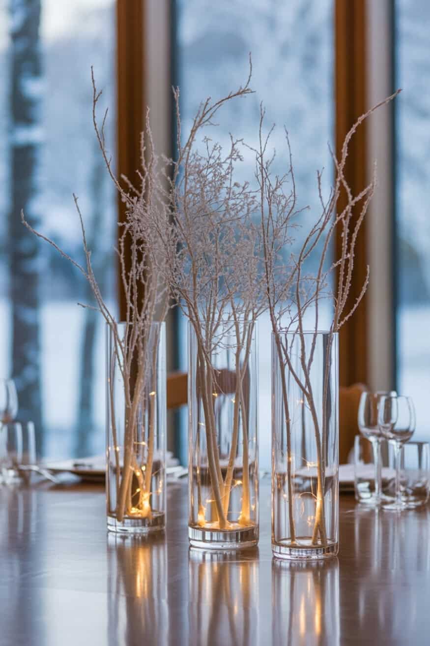 For height without clutter, place bare birch or silver-painted branches inside tall glass cylinders. Add fairy lights inside the vase for a subtle glow that ties in with winter evenings.